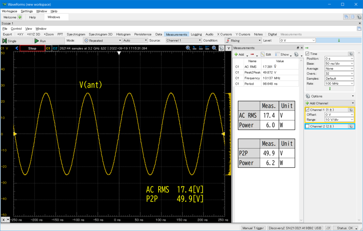 送信電力はUSBオシロスコープ(AnalogDiscovery2)で測定しました。DC電源は13.8Vです。